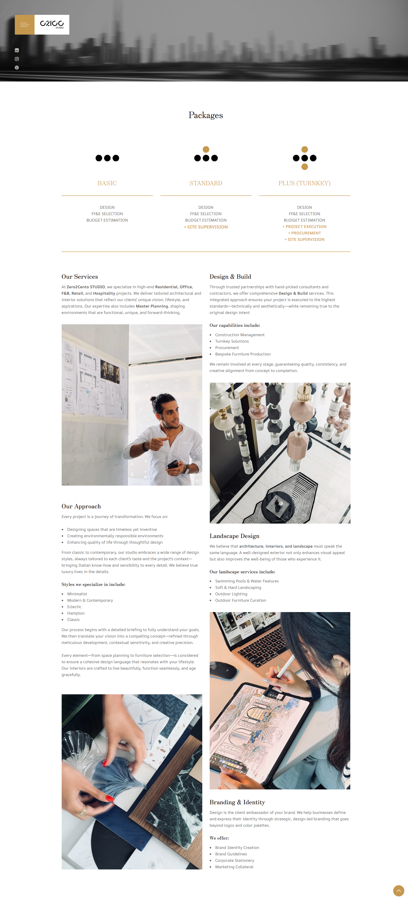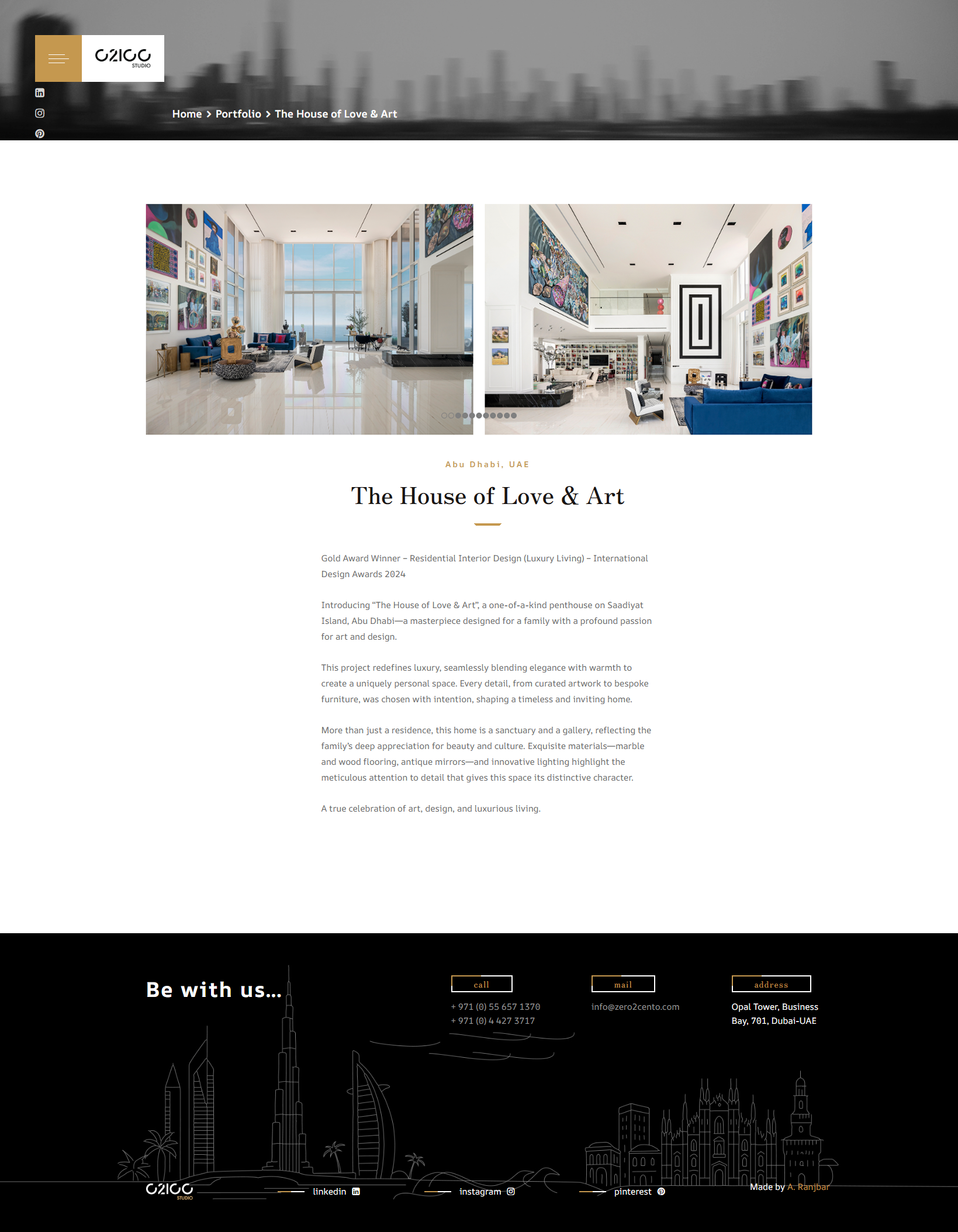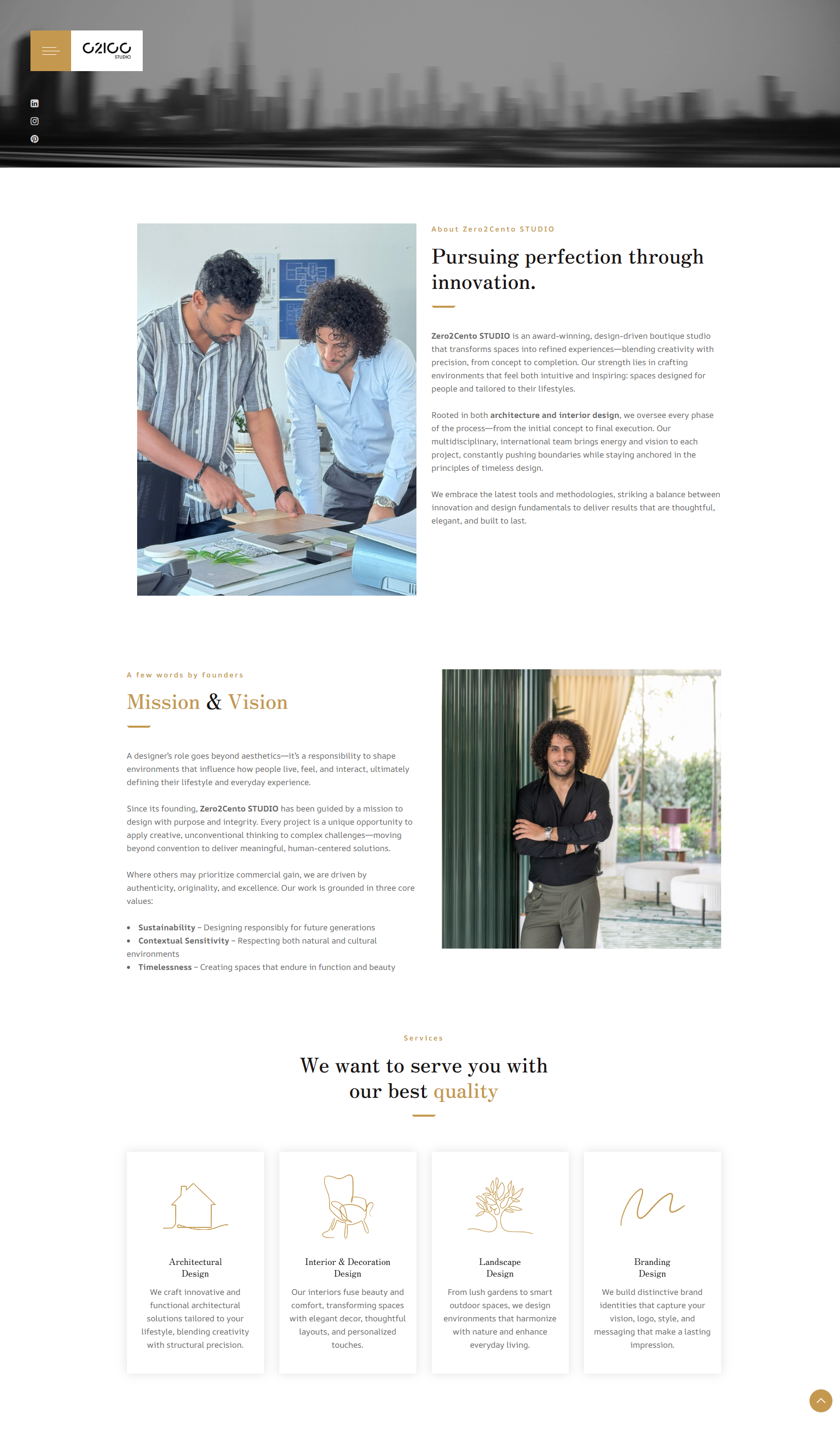 One of the key challenges was presenting Zero2Cento’s multidisciplinary portfolio in a way that felt unified and accessible. Each project had its own visual identity and tone, so creating a structure that could showcase this range while maintaining a consistent brand feel required careful design planning. At the same time, the site needed to reflect elegance without becoming sterile or distant — striking the right emotional tone was critical. Performance was also a factor; the site heavily relies on high-quality visuals, and balancing image richness with fast load times demanded technical precision throughout the build.
